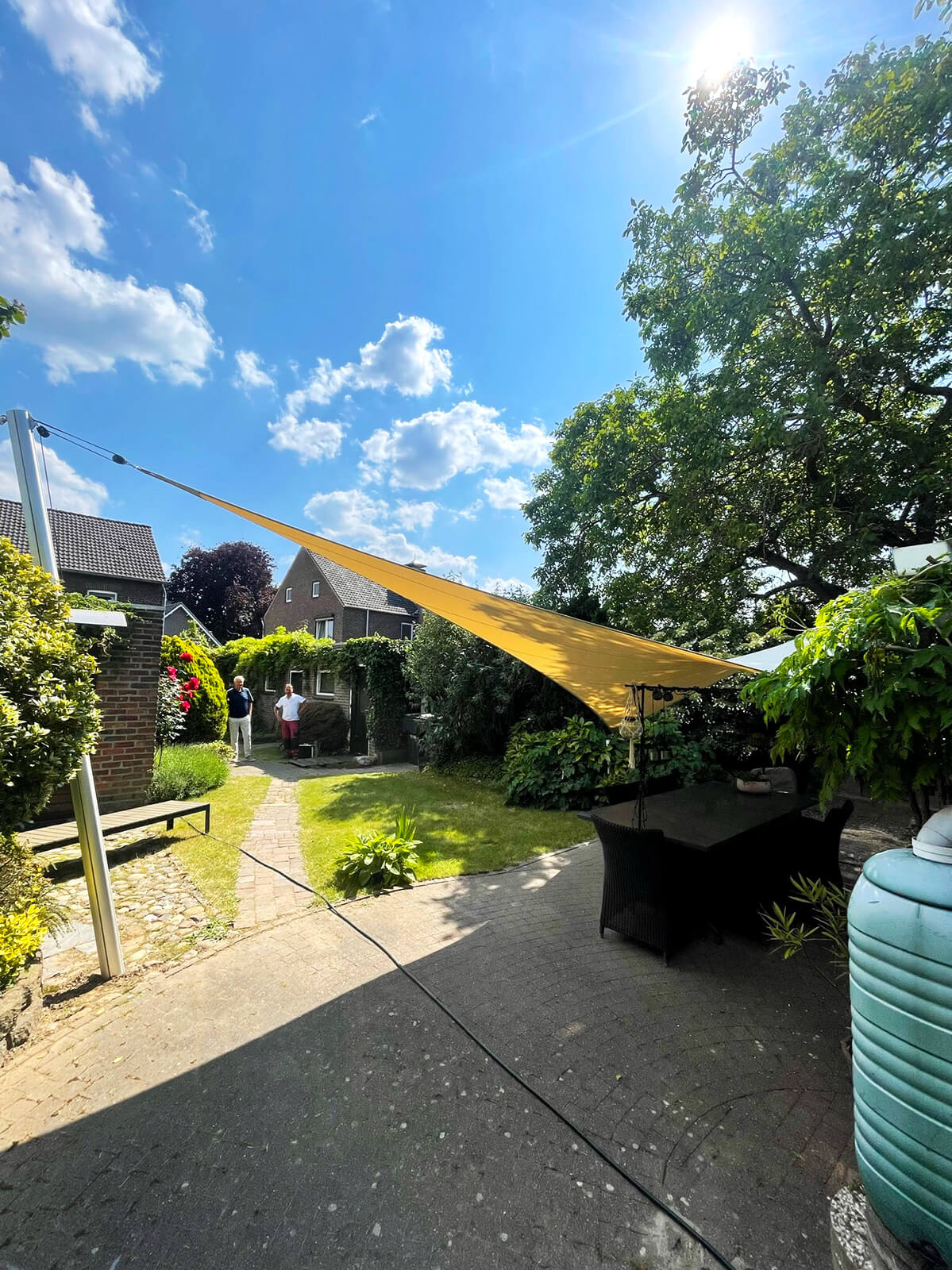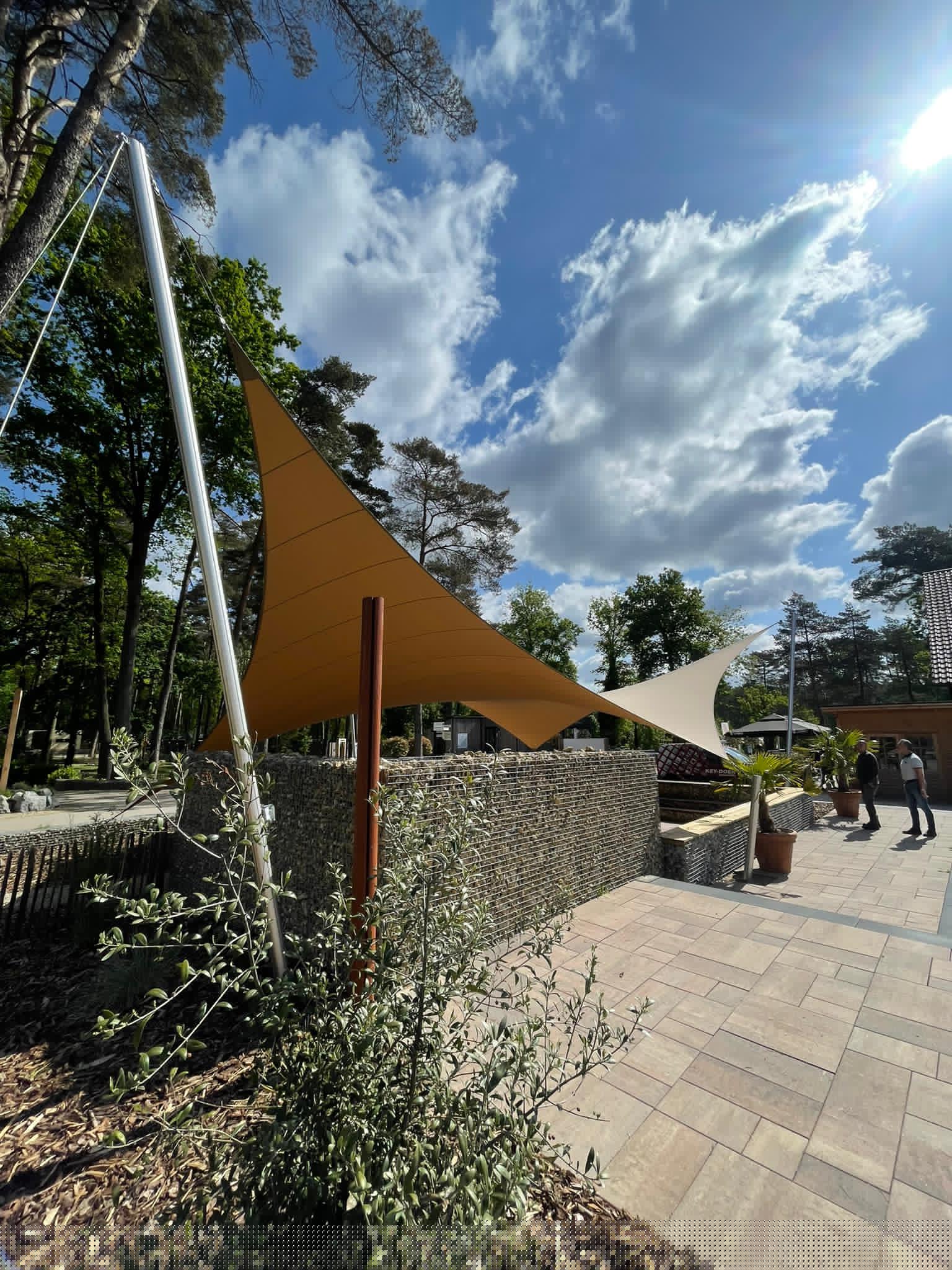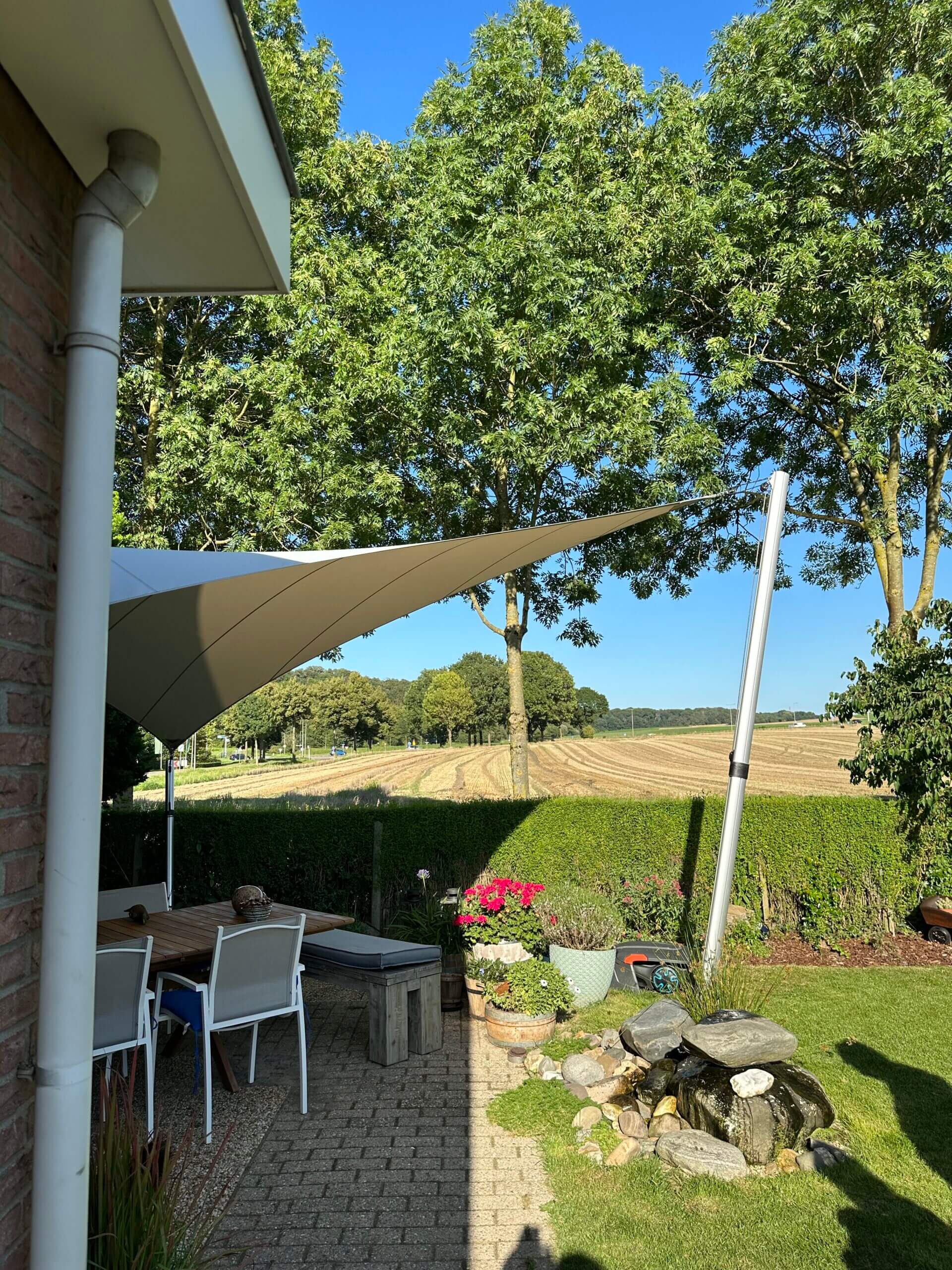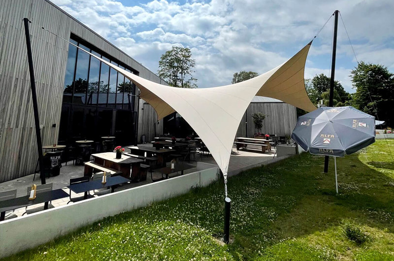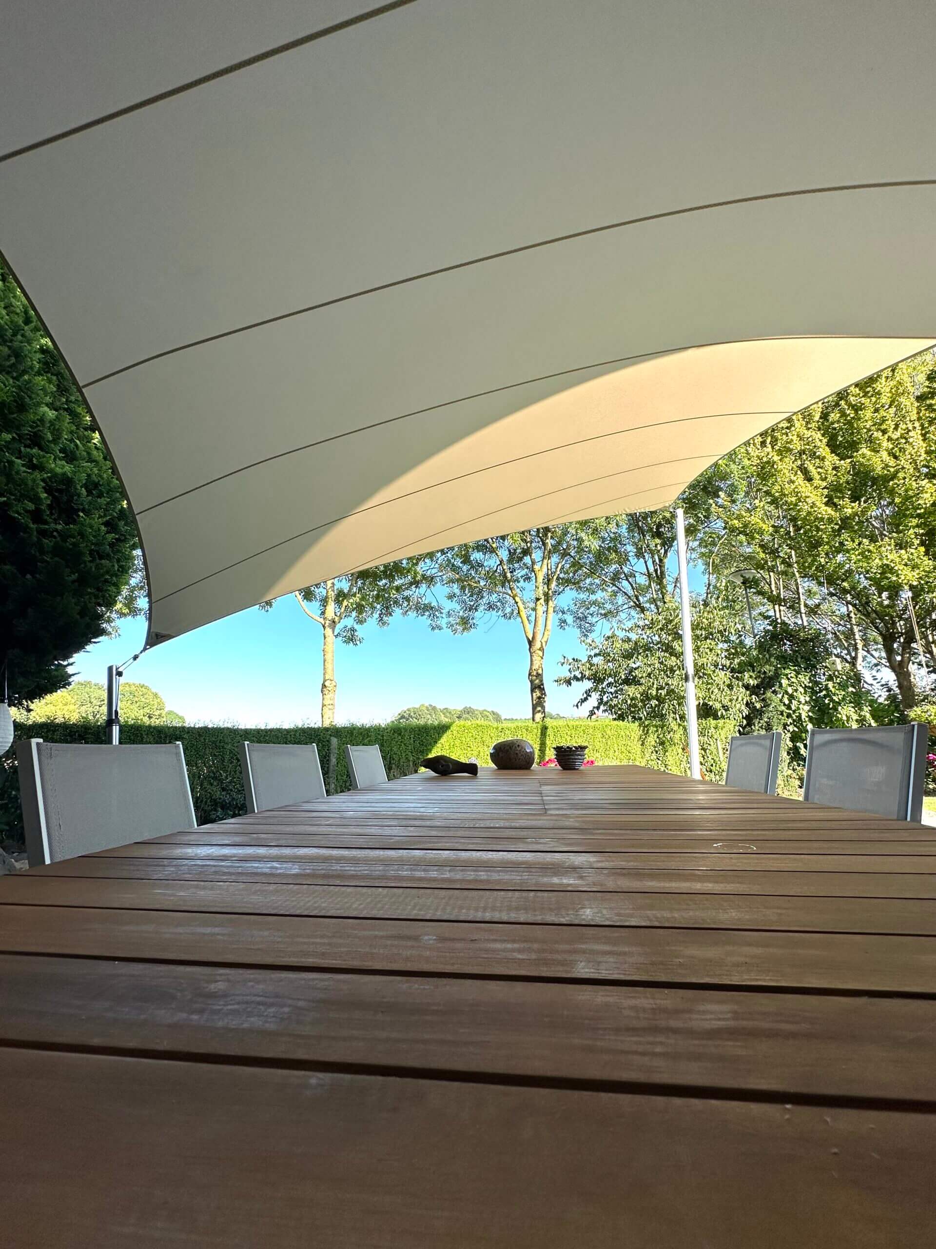 Dankzij het hoogteverschil tussen de bevestigingen blijven uw zichtlijnen uitstekend bewaard. Met behulp van een 3D-schets bespreken we samen met u welke zichtlijnen u het liefst behoudt. Bovendien kunnen we met een schaduwanalyse exact laten zien hoe het schaduwpatroon gedurende de dag verandert. Doordat er nooit masten in het midden van de overkapping worden geplaatst, blijft een panoramisch uitzicht altijd behouden.