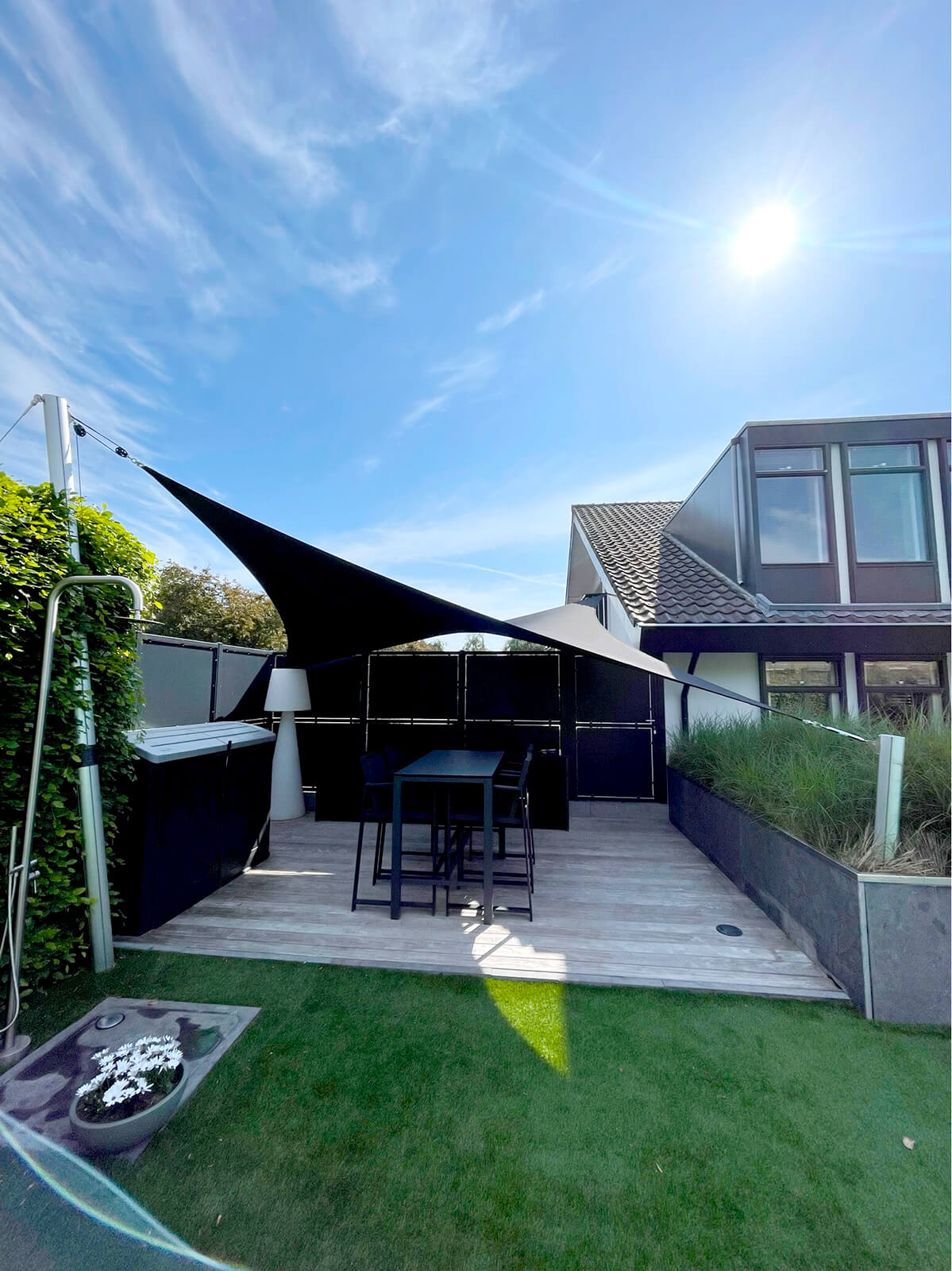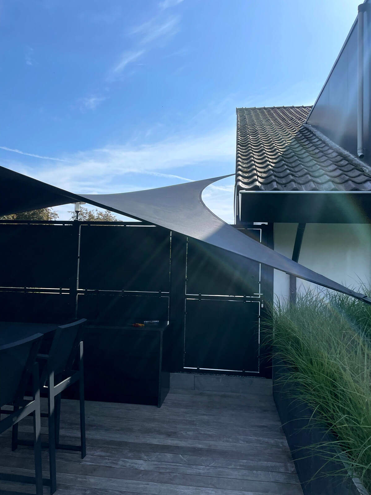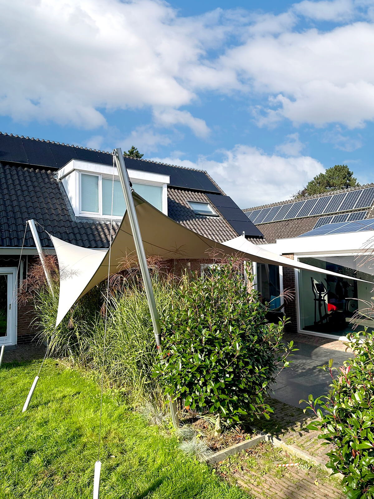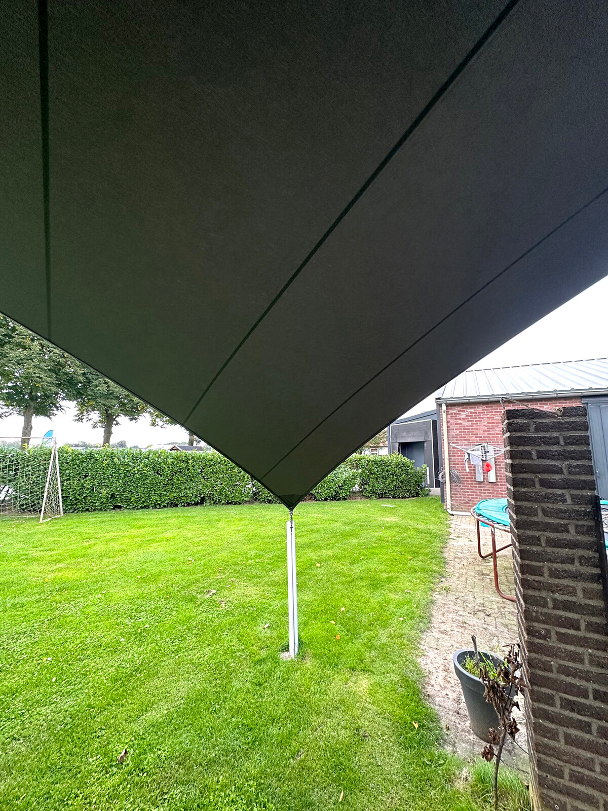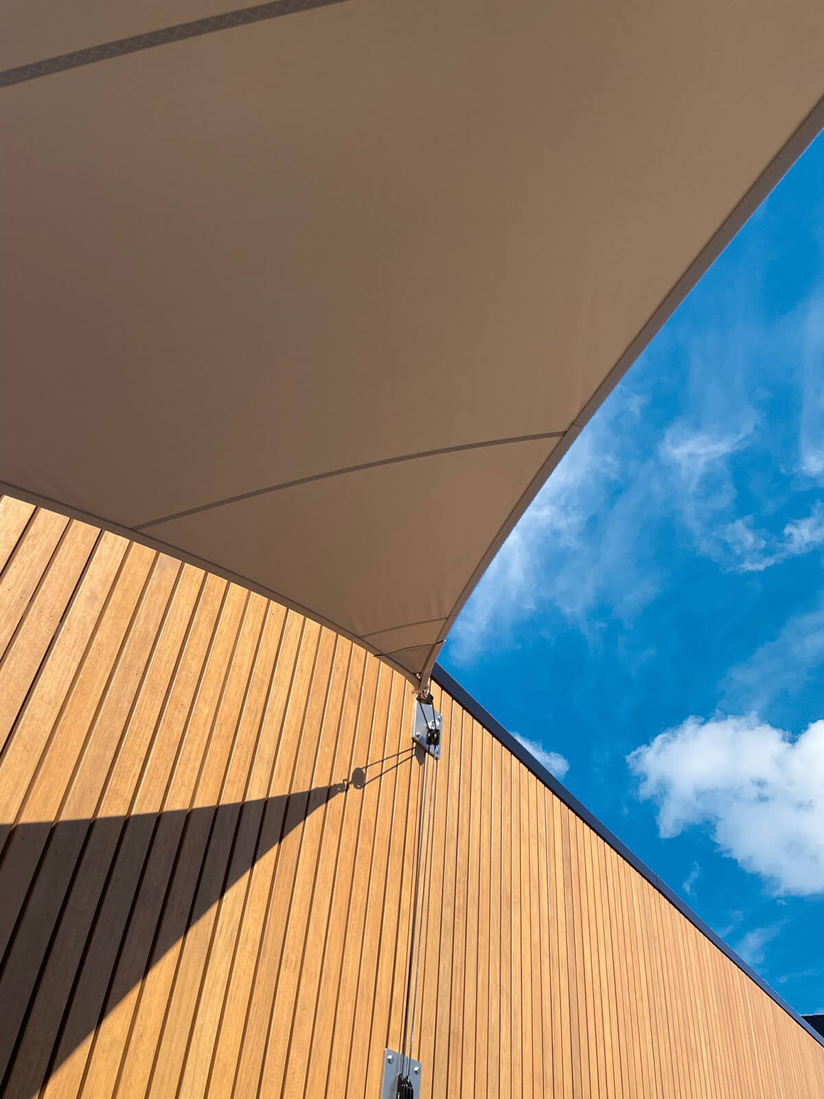 Dankzij het hoogteverschil tussen de bevestigingen blijven uw zichtlijnen uitstekend bewaard. Met behulp van een 3D-schets bespreken we samen met u welke zichtlijnen u het liefst behoudt. Bovendien kunnen we met een schaduwanalyse exact laten zien hoe het schaduwpatroon gedurende de dag verandert. Doordat er nooit masten in het midden van de overkapping worden geplaatst, blijft een panoramisch uitzicht altijd behouden.