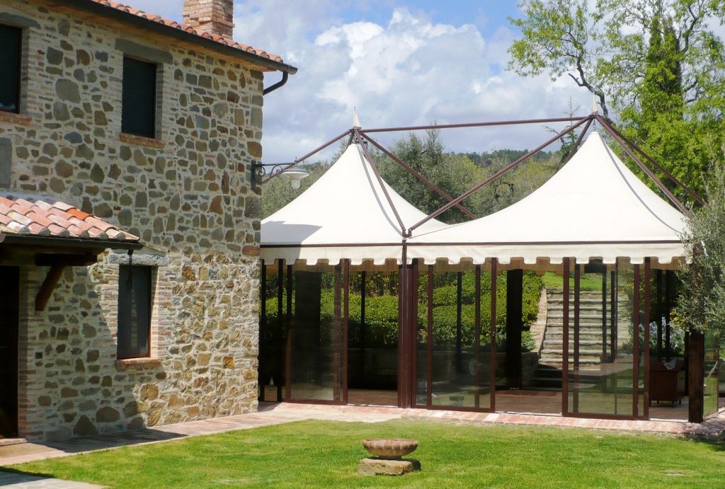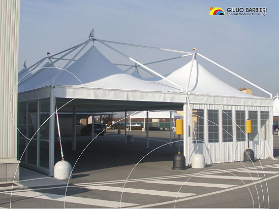 - Buiten aluminium draagcontructie met PVC binnenzeil met twee of vier punten.