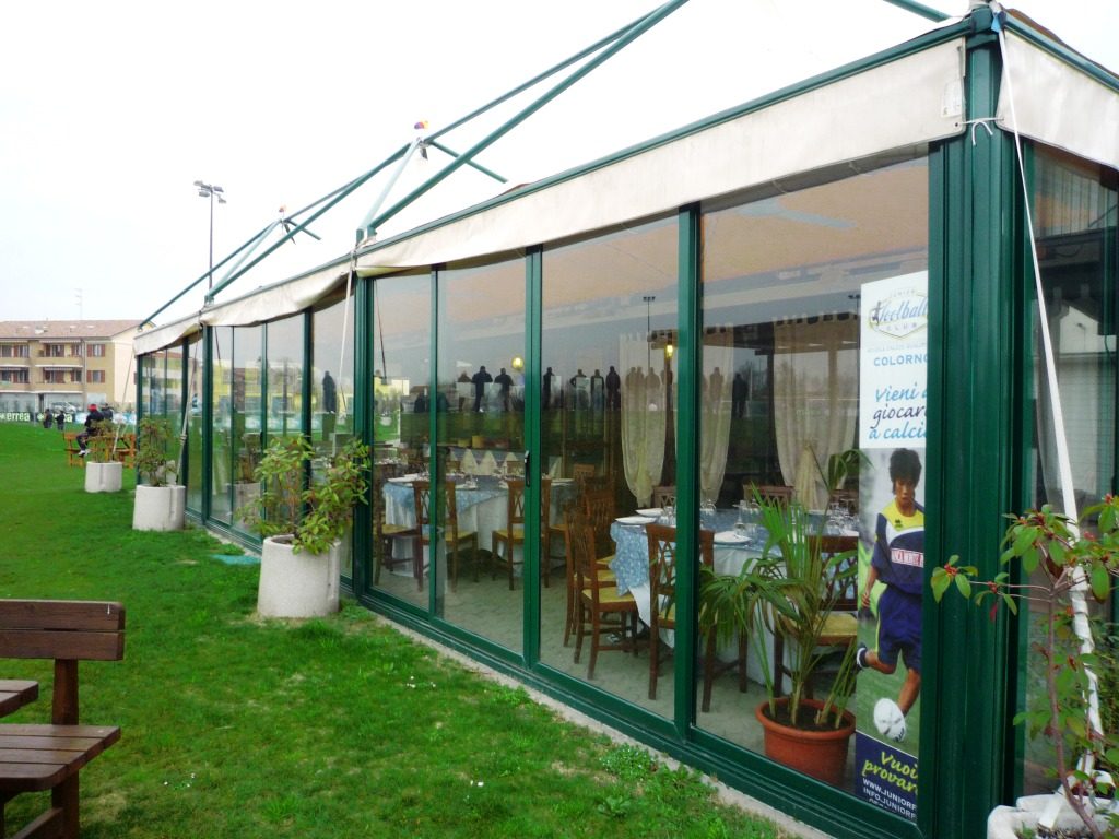 - Stevige wanden met schuifbare delen of met PVC zeilen wanden een aluminium profiel en een ‘clack’ afsluitsysteem.