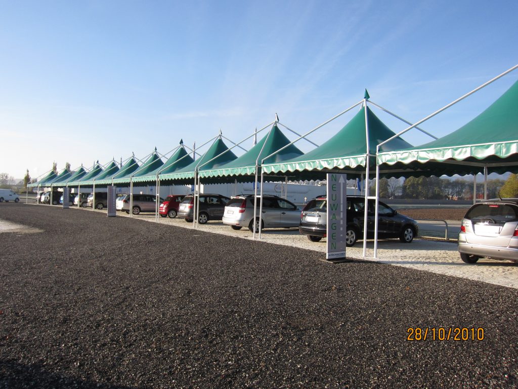 - Externe aluminium draagcontructie en PVC zeil overkapping met 1 punt.