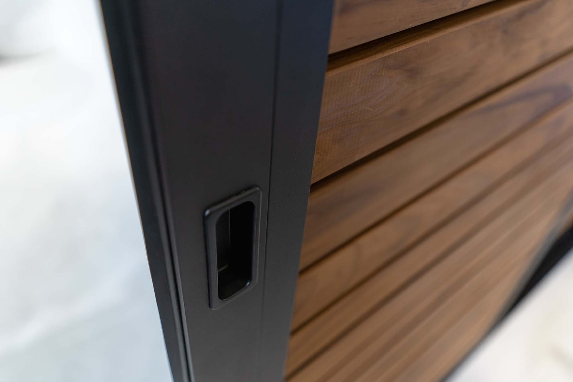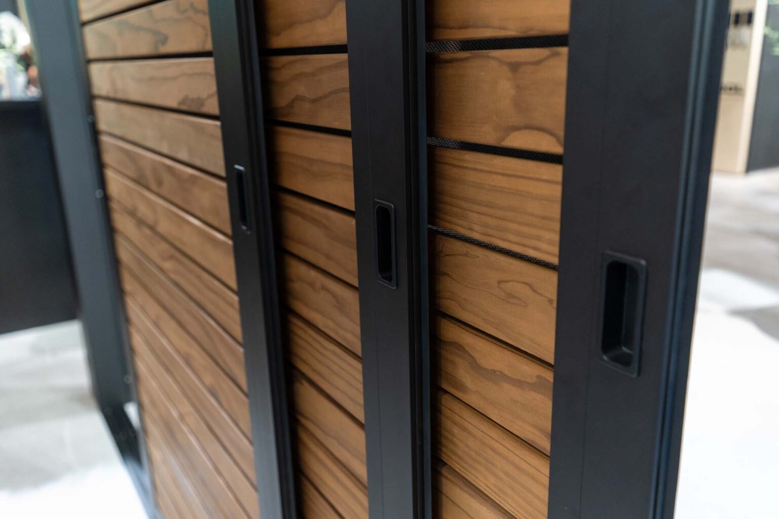 De afzonderlijke panelen verschuiven horizontaal in één en/of twee richtingen. De schuifkaders worden vervaardigd uit geëxtrudeerd aluminium en de lamellen uit ecologisch Thermowood, Radiata Pine. - Bescherming tegen zon en wind