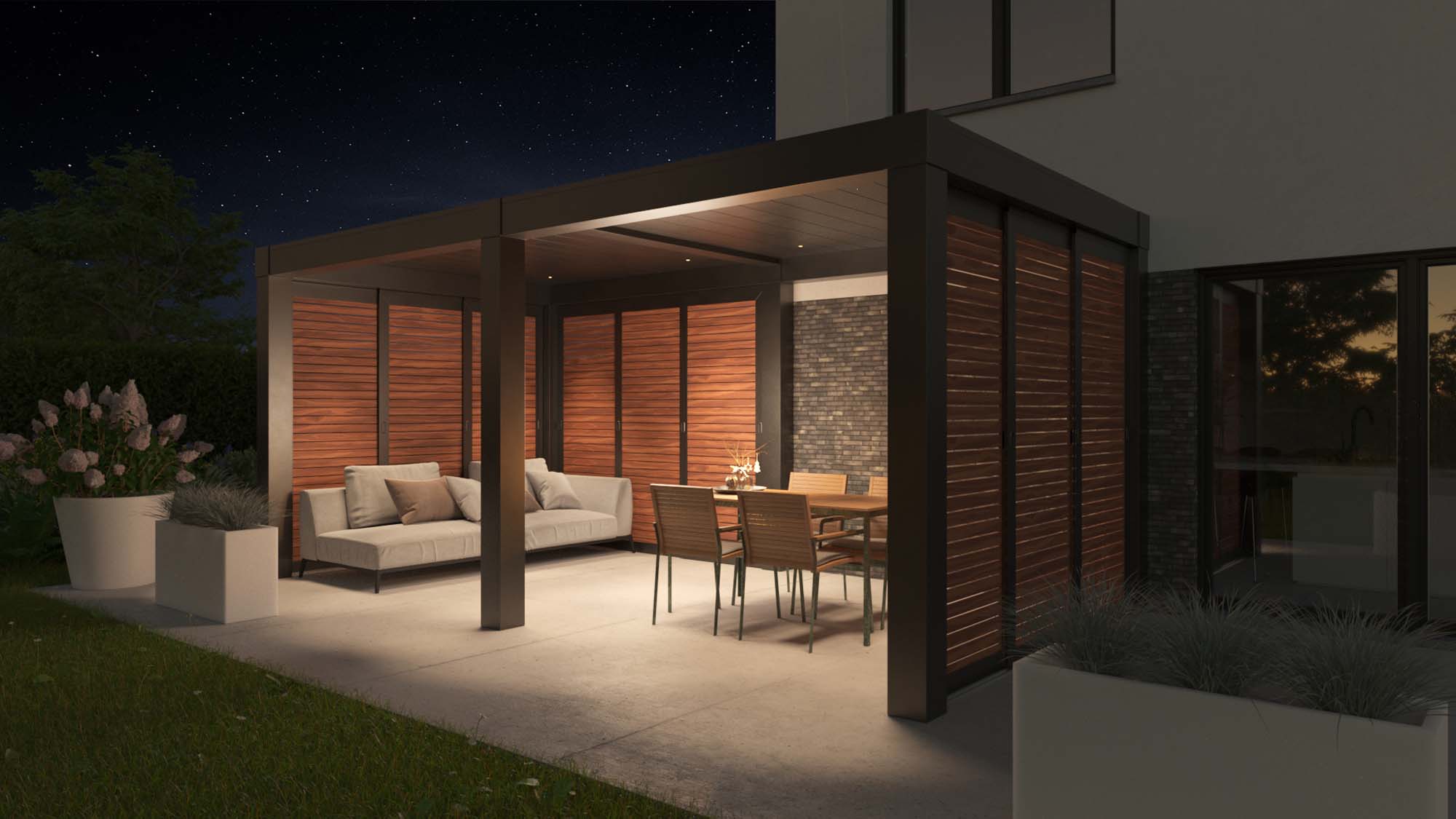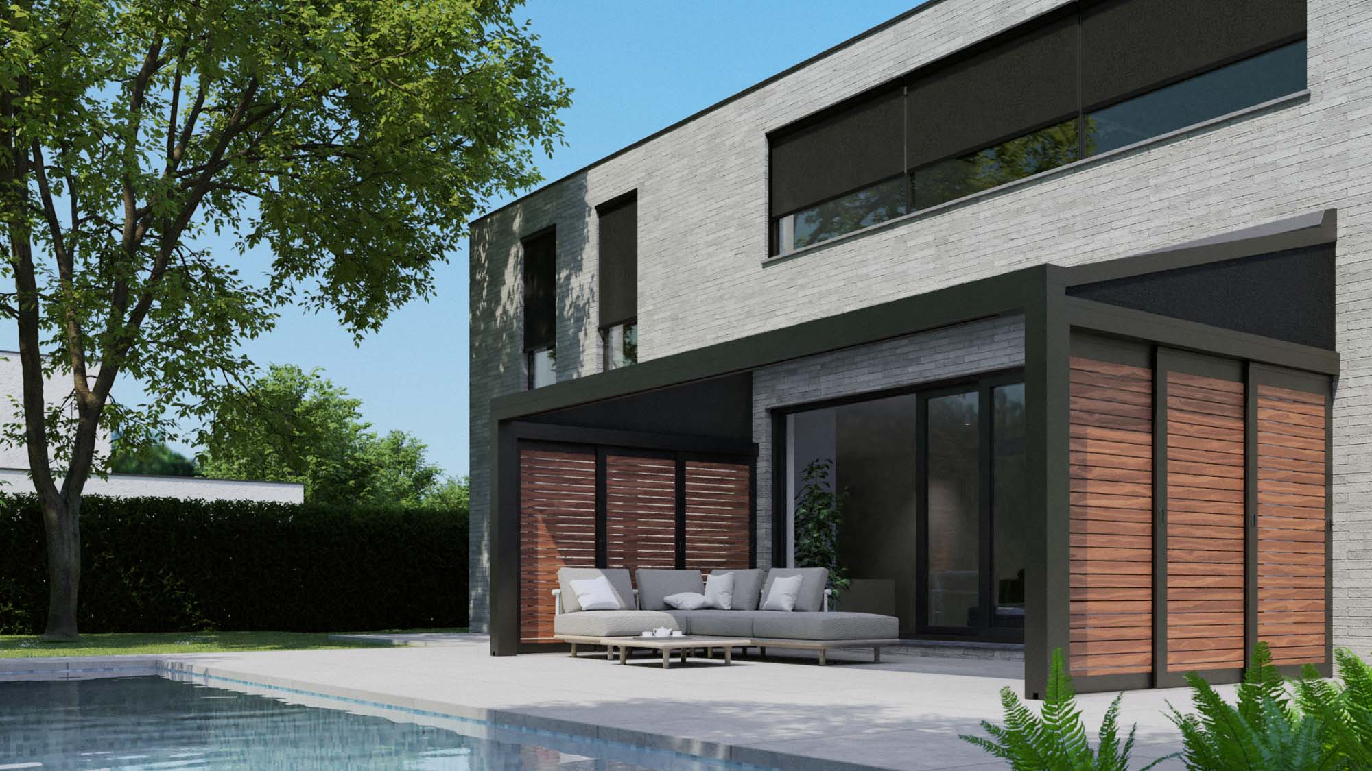 Houten schuifwanden zijn niet alleen een stijlvolle toevoeging aan je terrasoverkapping, maar bieden ook privacy en een gezellige sfeer. Onze wanden zijn vervaardigd uit thermisch gehard hout, wat extreem weersbestendig is. - Optionele screendoek