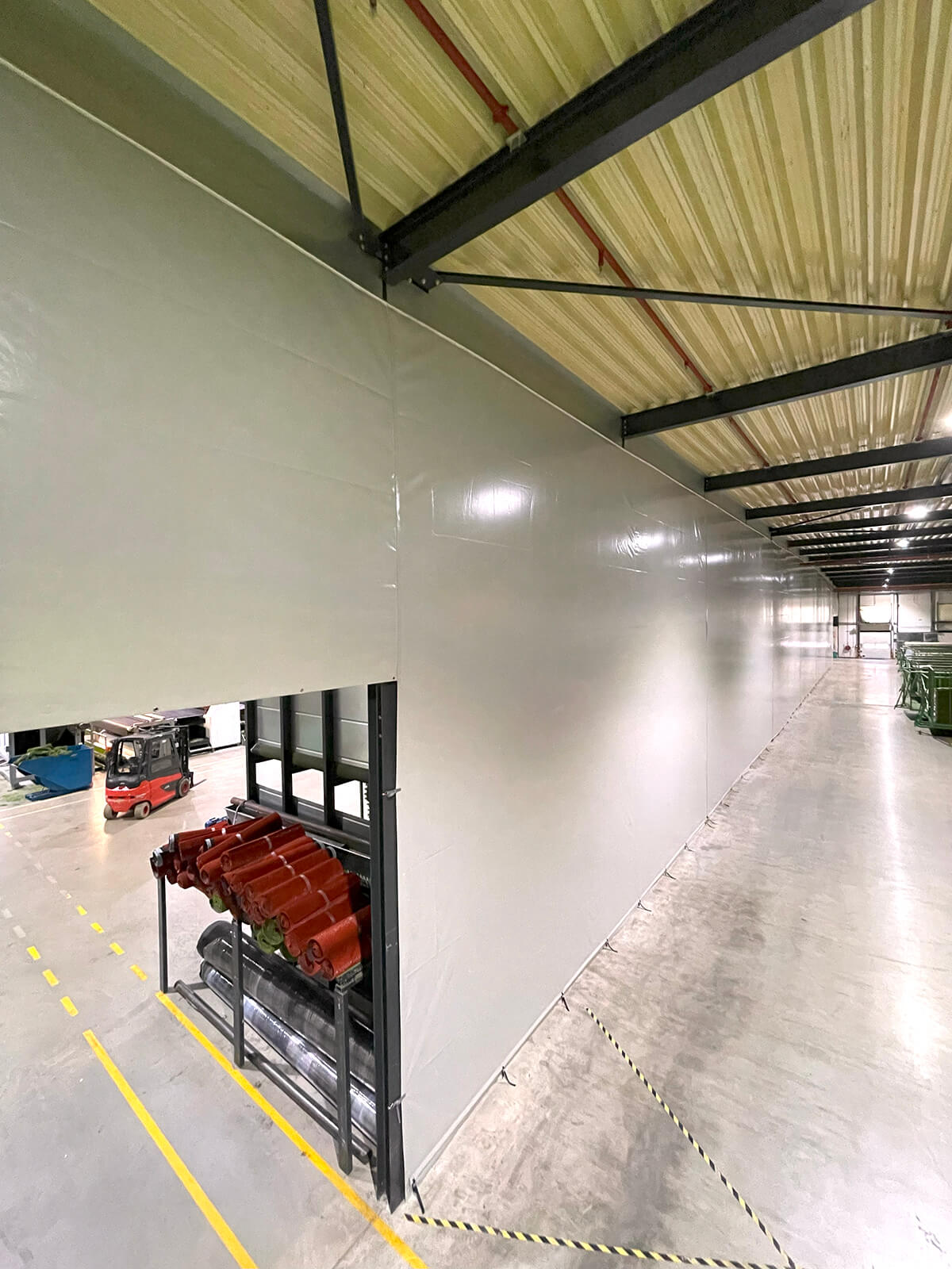 Wij produceren industriële gordijnen van hoogwaardig brandwerend PVC, geleverd met certificaat. U kunt kiezen uit strokengordijnen, schuivende afscheidingen of vaste afschermzeilen, eventueel uitgevoerd met transparante ramen of lamellenstroken voor extra gebruiksgemak.