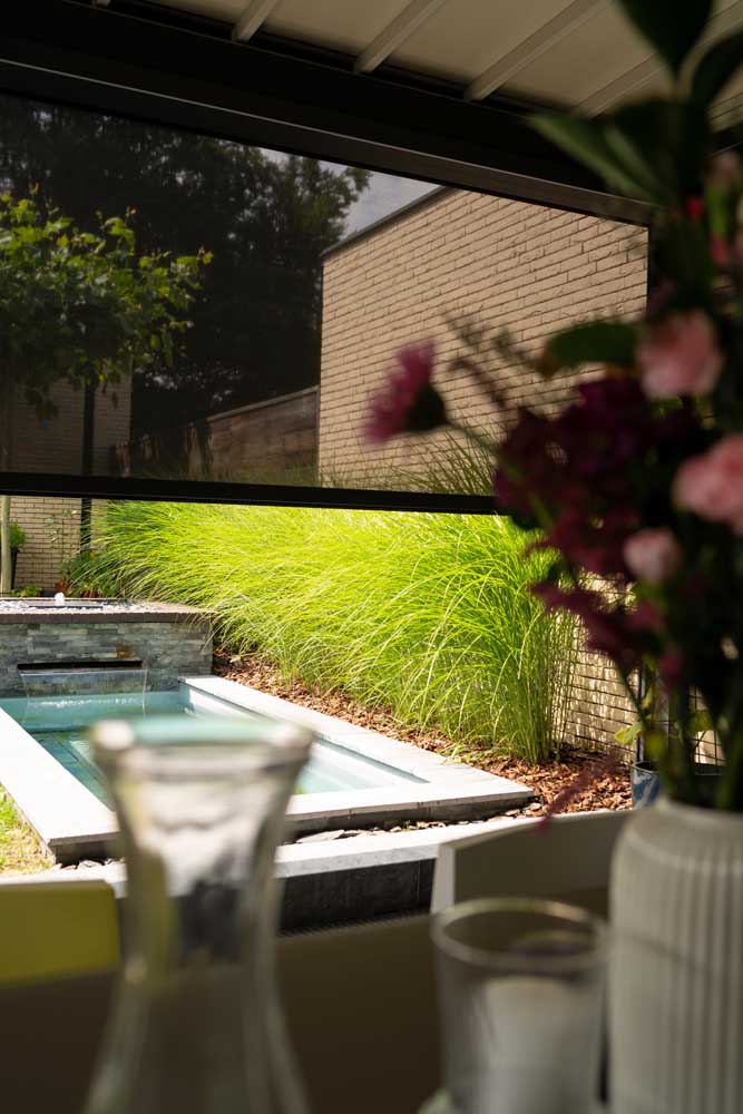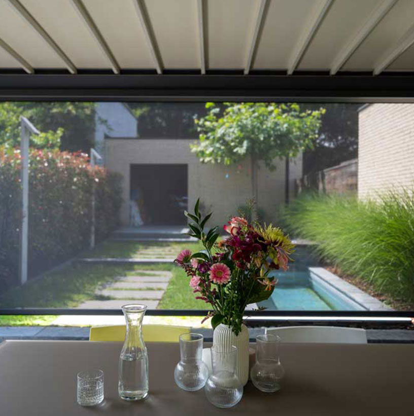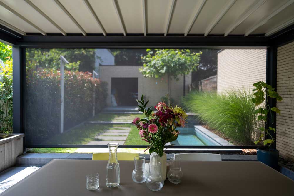 Vouwdak Nomo biedt de mogelijkheid tot geïntegreerde screens, die optioneel zijn en je terrasoverkapping extra comfort bieden. Deze screens beschermen tegen weerelementen en zorgen ervoor dat je langer van je terras kan genieten. - Houten of glazen schuifwanden