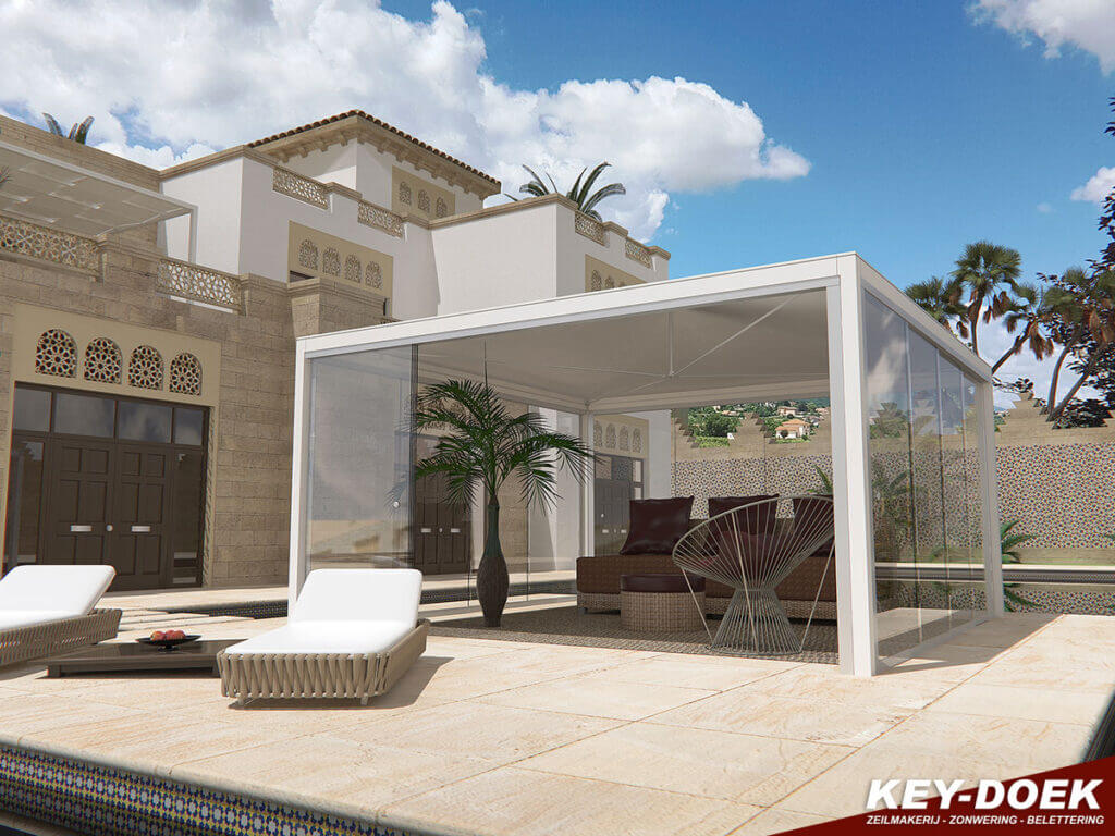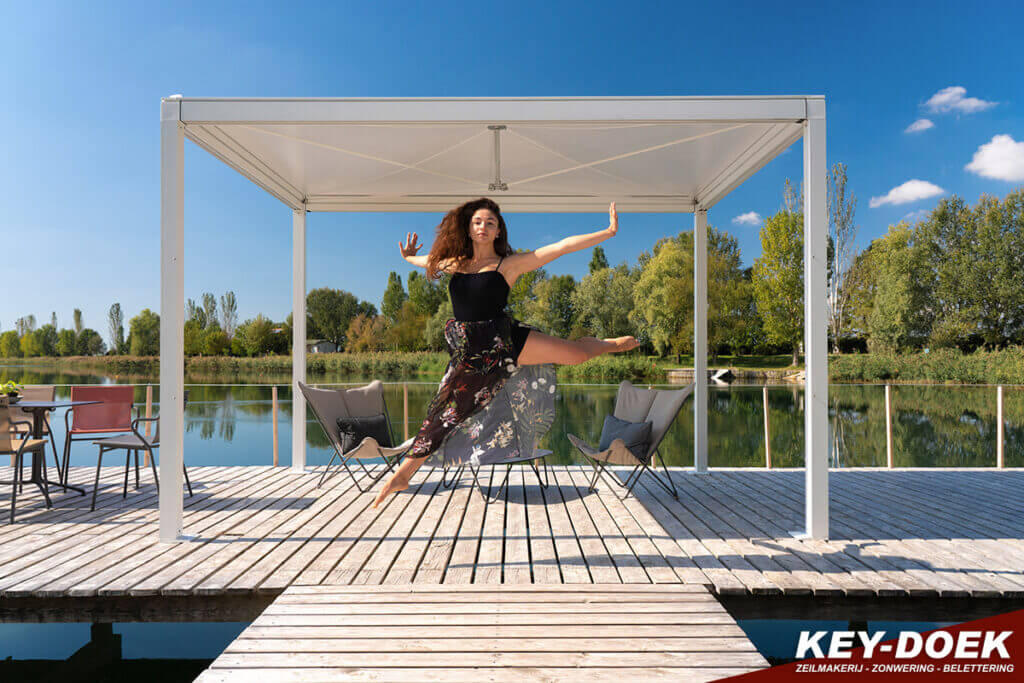 De Qzebo veranda is volledig vervaardigd uit aluminium, wat zorgt voor een lichte maar robuuste constructie. Het doek wordt strak gespannen van binnenuit door een systeem van aluminium profielen, die perfect integreren met de zijbalken voor een unieke en minimalistische uitstraling.