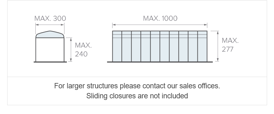 Afhankelijk van het model hebben we verschillende configuraties die veelzijdig gebruik mogelijk maken met variabele geometrieën en de mogelijkheid van toekomstige verlengingen in lengte, dankzij de modulariteit van de structuur en de individueel ingevoegde vellen in de speciale lugs van de profielen van elke boog.