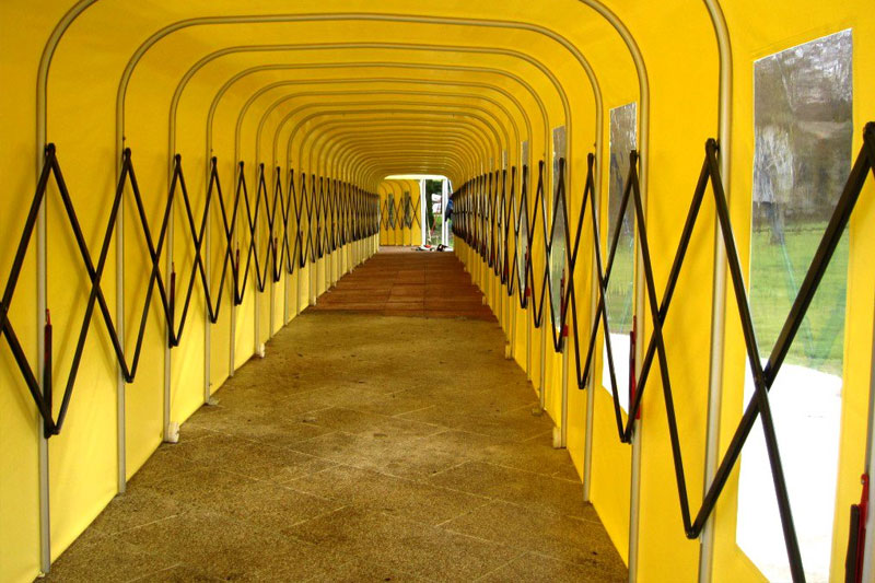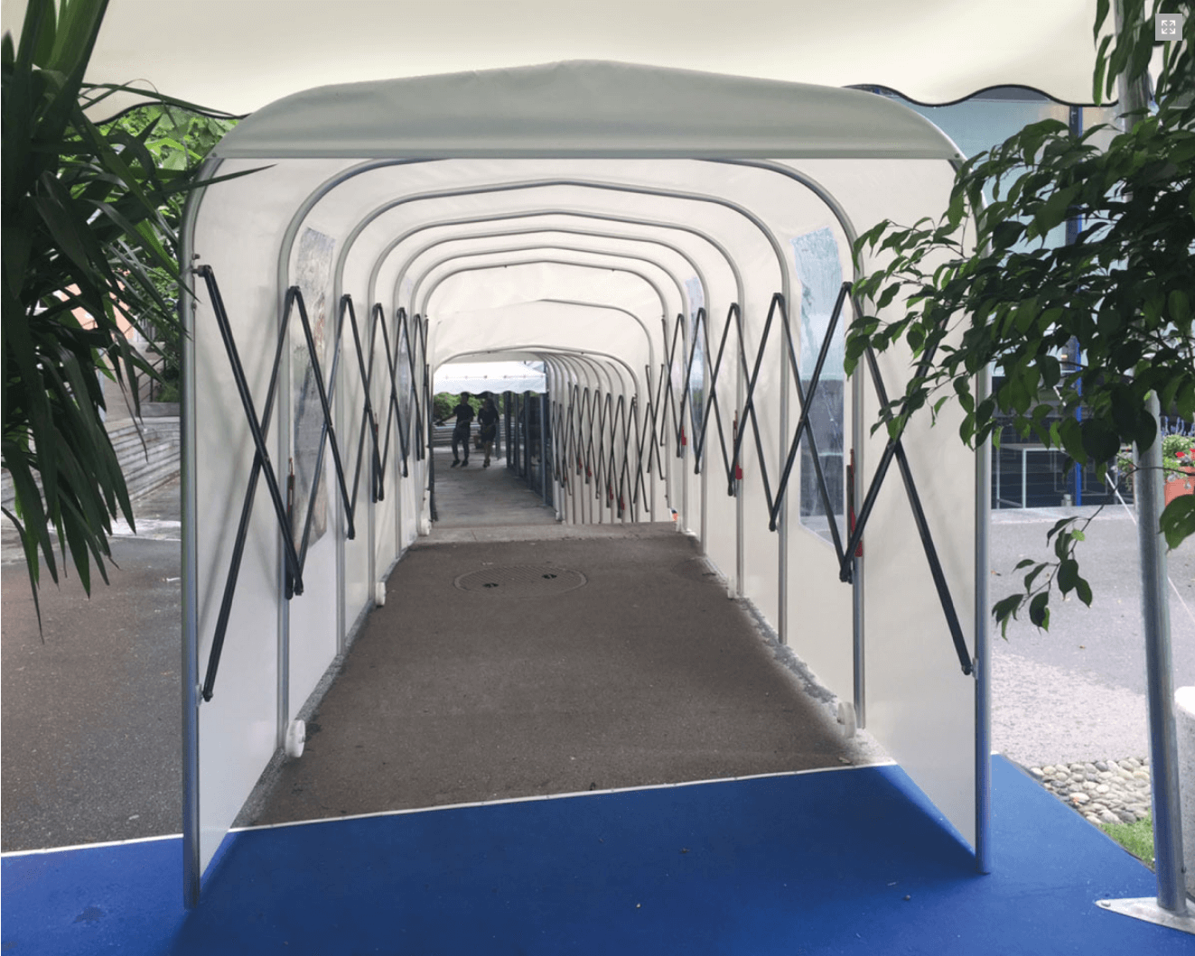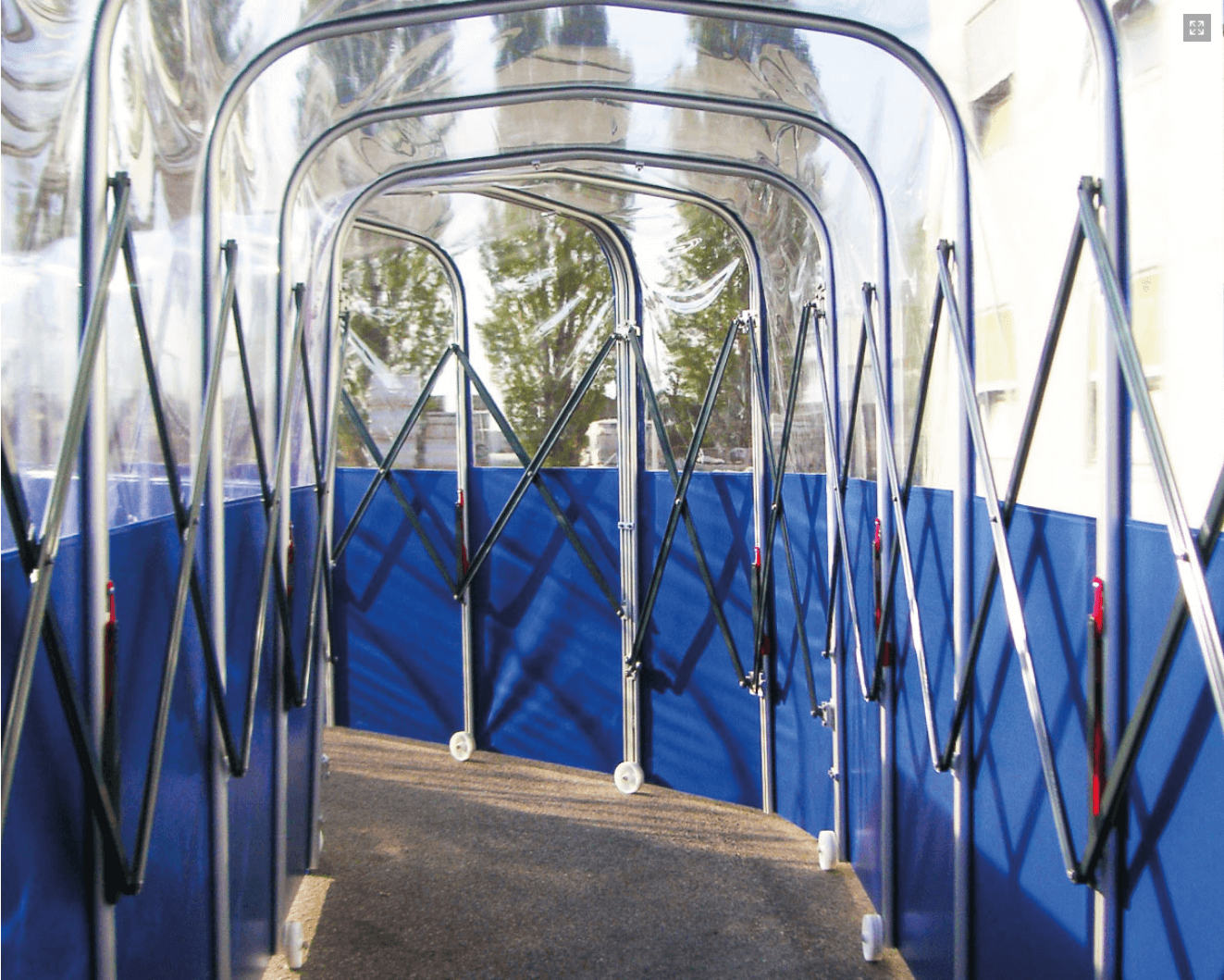 - Iedere module is compleet met aluminium pantograven en relaterend spannings-systeem. Daardoor kan de inschuifbare tunnel eenvoudig open en dicht gemaakt worden. Eenmaal gesloten neemt het systeem minimaal plaats in beslag.
